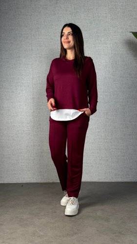 Kadın uzun kollu bisiklet yaka viskon iki iplik mor bluz ve pantolon ikili takım