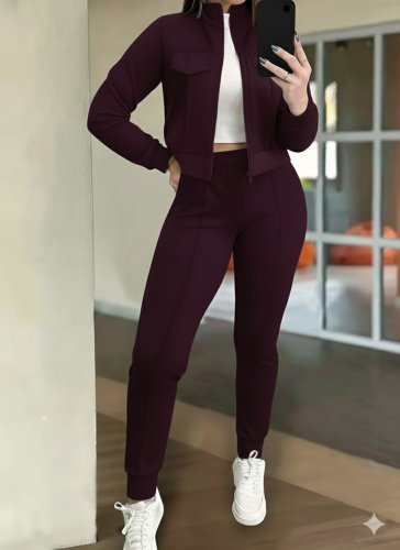 Kadın uzun kollu önden fermuarlı kısa modal mor ceket ve pantolon ikili takım