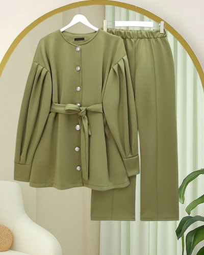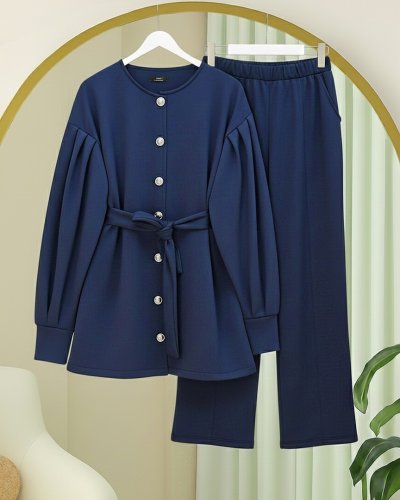 Beli Kemerli Önü Düğmeli Pantolonlu Scuba Takım Laci