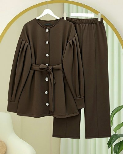 Beli Kemerli Önü Düğmeli Pantolonlu Scuba Takım Kahve
