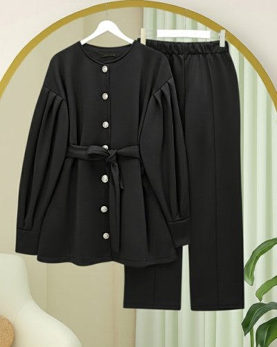 Beli Kemerli Önü Düğmeli Pantolonlu Scuba Takım Siyah