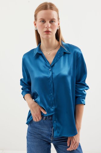 3964 Hafif Dökümlü Saten Gömlek Petrol