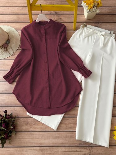 Kol Manşeti Drapeli Oval Kesim Gömlek Bordo
