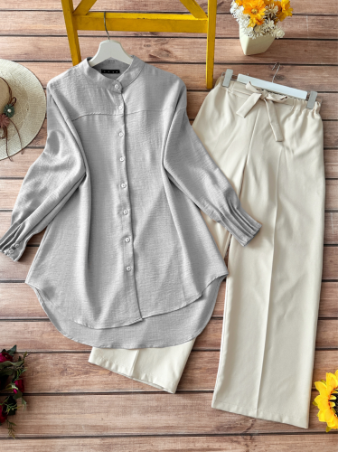 Kol Manşeti Drapeli Oval Kesim Gömlek Gri