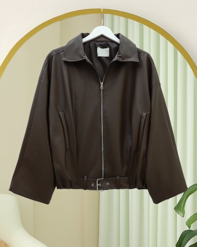 İçi Astarlı Beli Kat Detaylı Kemerli Deri Ceket Kahve
