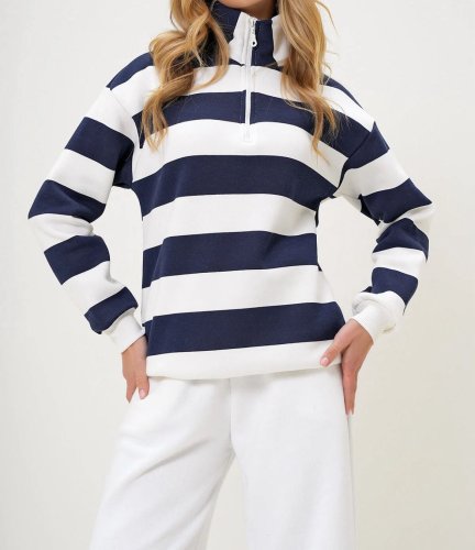 Kadın uzun kollu balıkçı yaka fermuar detay şeritli üç iplik kumaş sweat