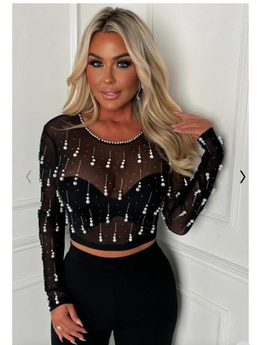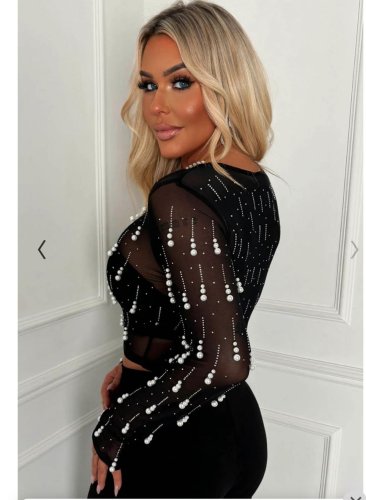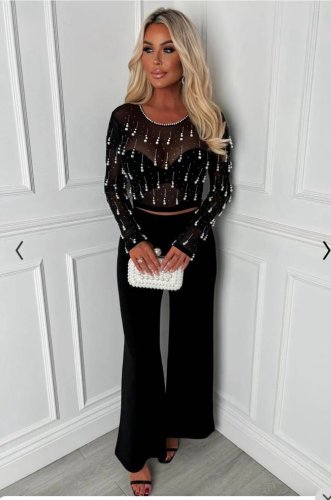 • Kadın bisiklet yaka inci detay full transparan bluz ve yüksek bel ispanyol paça dalgıç kumaş pantolon ikili takım