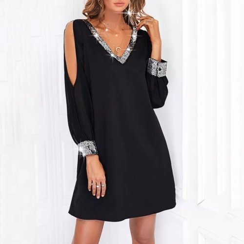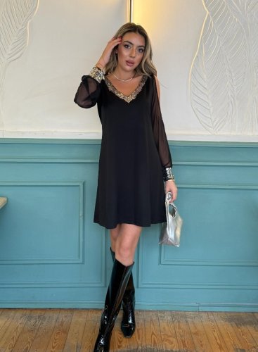 • Kadın uzun kollu V yaka kollar tül yırtmaç detay kol manşetleri ve yaka payet krep elbise
