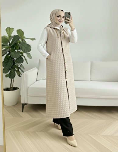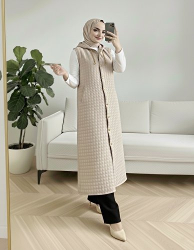 • Boydan Düğmeli Kapşonlu Cepli Kapitone Uzun Yelek Taş
