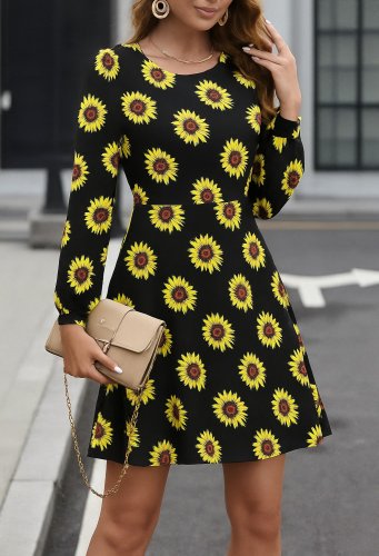 • Kadın uzun kollu bisiklet yaka desenli kısa krep elbise