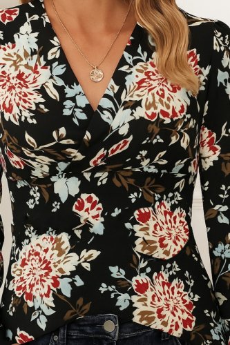 • Kadın uzun kollu kruvaze yakalı kelebek desenli şardonlu dalgıç bluz