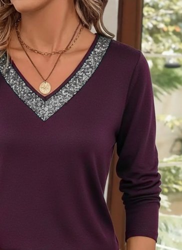 • Kadın uzun kollu v payet yakalı viskon mürdüm bluz