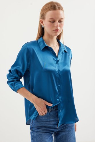 3964 Hafif Dökümlü Saten Gömlek Petrol