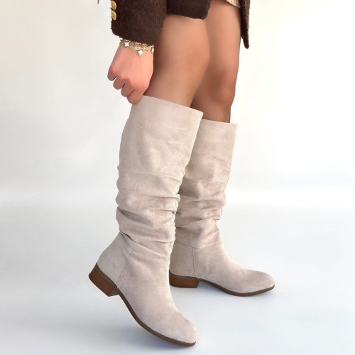 • Winda Bej Süet Körüklü Topuklu Çizme