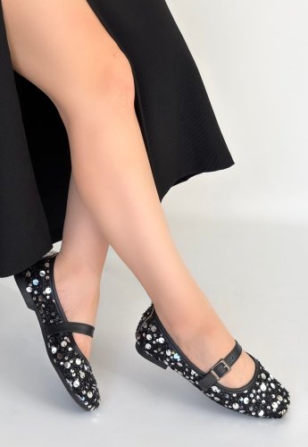 • Zaty Siyah Süet Gümüş Pullu Babet Ayakkabı