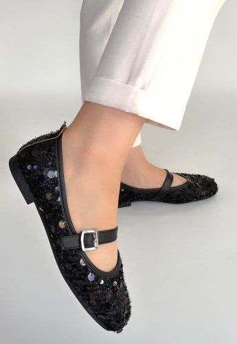 • Zaty Siyah Süet Siyah Pullu Babet Ayakkabı
