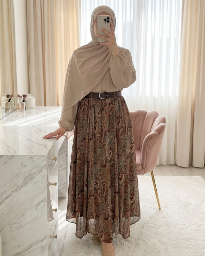 • Asimetrik Kesim Astarlı Kemerli Şifon Etek Haki