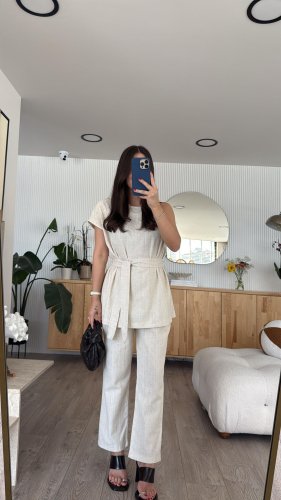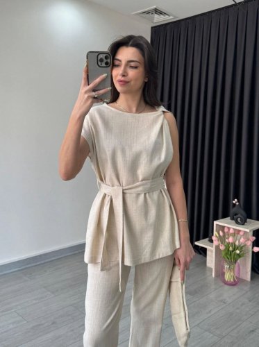 • Kadın omuz detay kuşak dahil bluz ve pantolon keten kumaş ikili takım