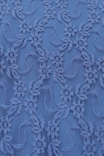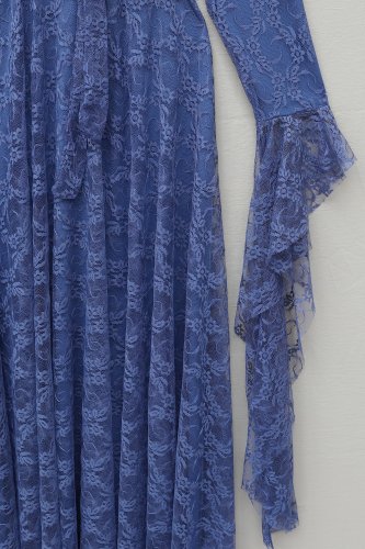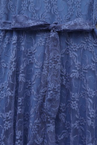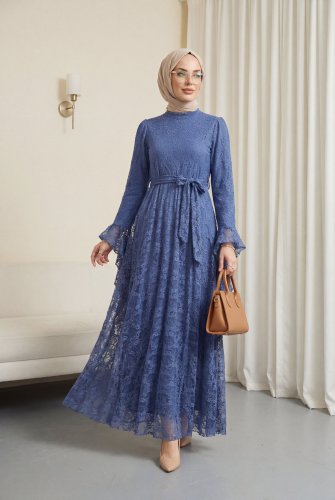 • Çiçek Desenli Güpür Dantelli Kolu Volanlı Kemerli Astarlı Elbise İndigo