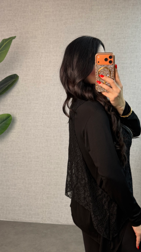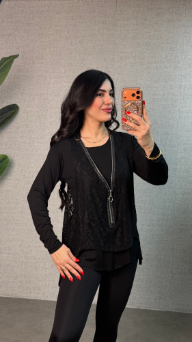 • Kadın uzun kollu asimetrik kesim bluz ve dantel güpür transparan detay fermuarlı yelek ikili takım