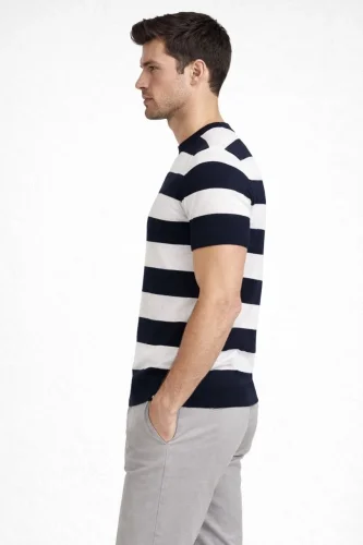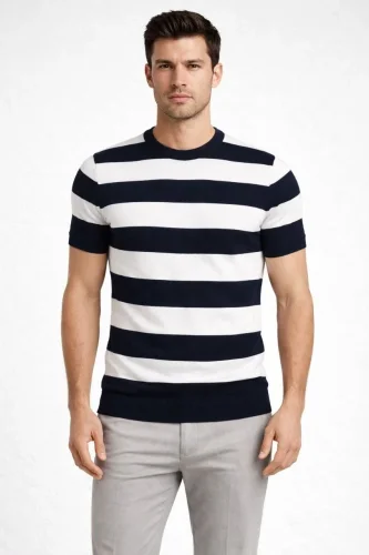 Erkek Tshirt Çizgili Triko Dokuma Bisiklet Yaka Tişört Siyah