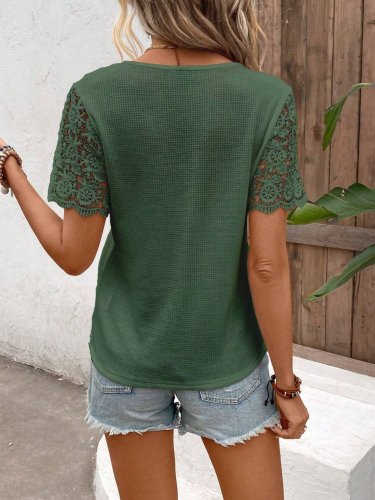 Kadın kısa kollu v yakalı önden düğmeli dantel detaylı waffle bluz