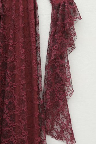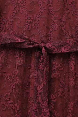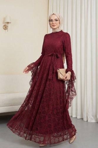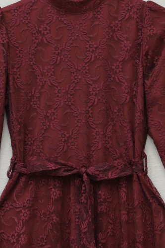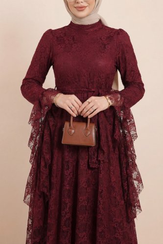 • Çiçek Desenli Güpür Dantelli Kolu Volanlı Kemerli Astarlı Elbise Bordo