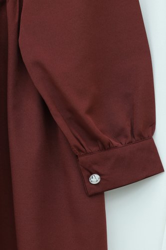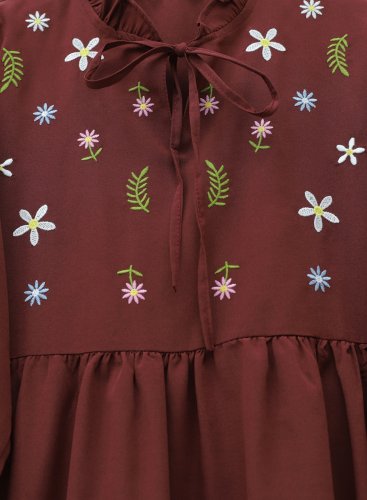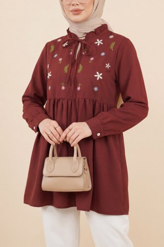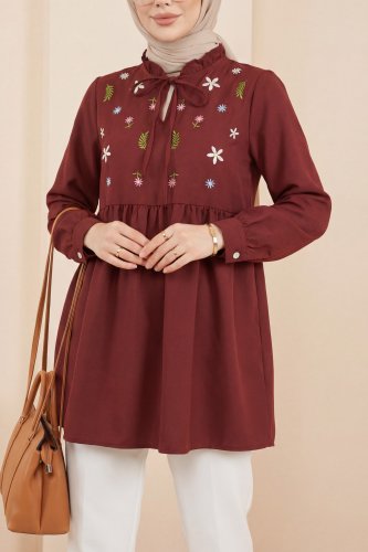 • V Yaka Bağlamalı Yakası Fırfırlı Çiçek Nakışlı Poplin Tunik Bordo
