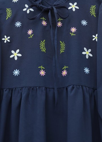 • V Yaka Bağlamalı Yakası Fırfırlı Çiçek Nakışlı Poplin Tunik Laci