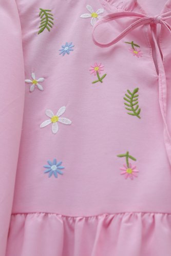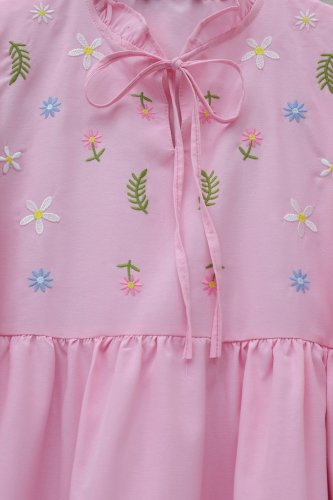 • V Yaka Bağlamalı Yakası Fırfırlı Çiçek Nakışlı Poplin Tunik Pembe