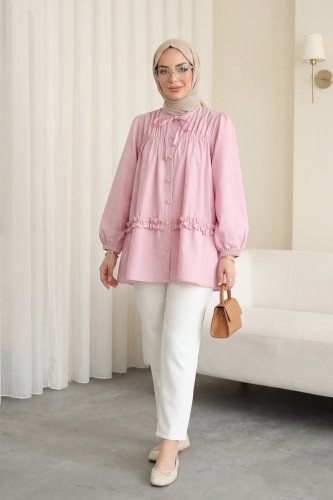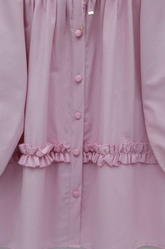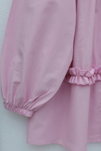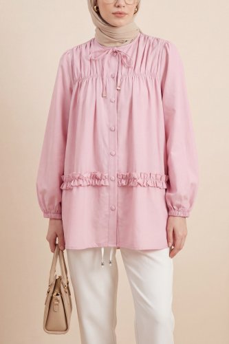 • Robadan Lastikli Eteği Fırfırlı Düğmeli Poplin Tunik Pembe