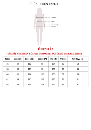 • Modelin Ölçüleri: Boy:165, Kilo:55, Göğüs:90, Bel:72, Kalça: 100