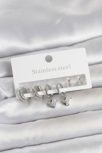 • 316L Çelik Gümüş Renk Kalp Detaylı Kadın Küpe Seti