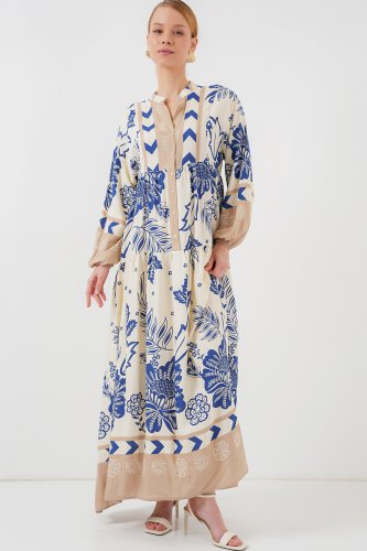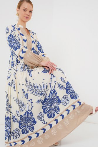 2423 Otantik Desenli Tesettür Elbise Lacivert 8