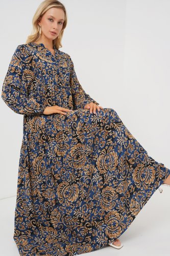 2423 Otantik Desenli Tesettür Elbise Lacivert 11
