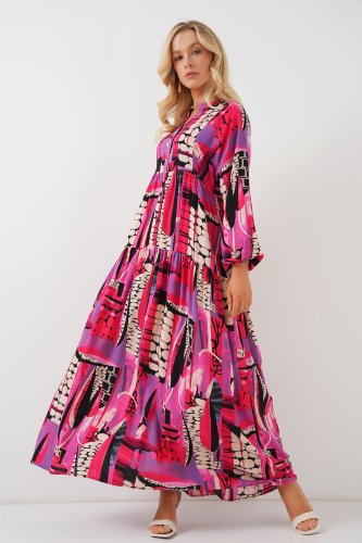 • 2423 Otantik Desenli Tesettür Elbise Siyah Mor
