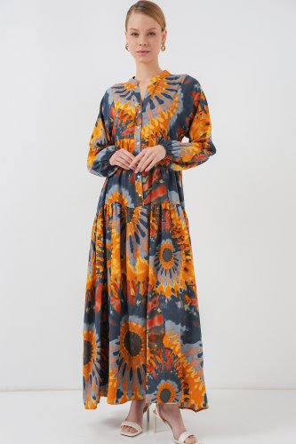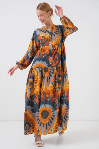 • 2423 Otantik Desenli Tesettür Elbise L Turuncu