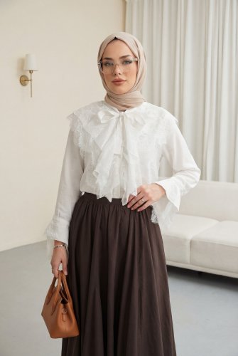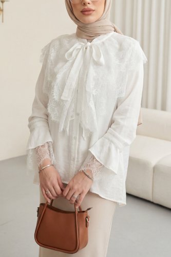 Yakası Bağcıklı Fırfırlı Dantel Detaylı Arkası Uzun Cupra Gömlek Beyaz
