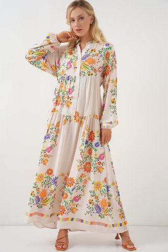 2423 Otantik Desenli Tesettür Elbise B Turuncu
